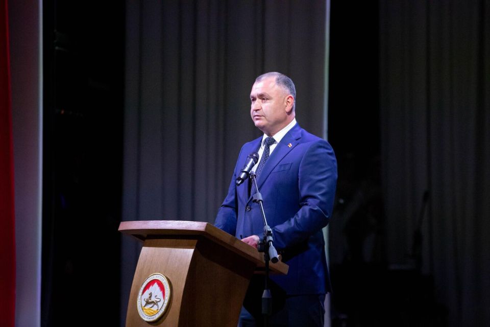 Президент РЮО Алан Гаглоев выступает на торжественном собрании, посвященном признанию республики Россией