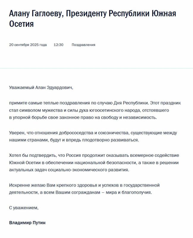 Россия продолжит оказывать содействие Южной Осетии в обеспечении национальной безопасности, говорится в поздравительной телеграмме Владимира Путина президенту Республики Южная Осетия Алану Гаглоеву по случаю Дня республики