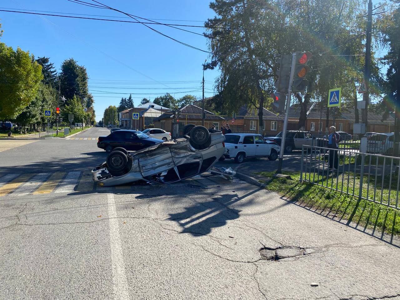 Водитель ВАЗ-2114 не уступил дорогу ВАЗ-2107, что привело к столкновению и переворачиванию машины.