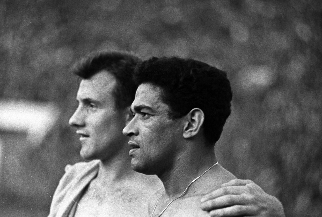 Футболист сборной СССР Василий Данилов и нападающий сборной Бразилии Гарринча.