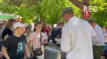 Вокруг полевой кухни на фронте всегда бурлила жизнь, так и здесь, на запах горячей и вкусной еды собралась целая очередь.Праздничные мероприятия продолжаются в Пионерском парке...