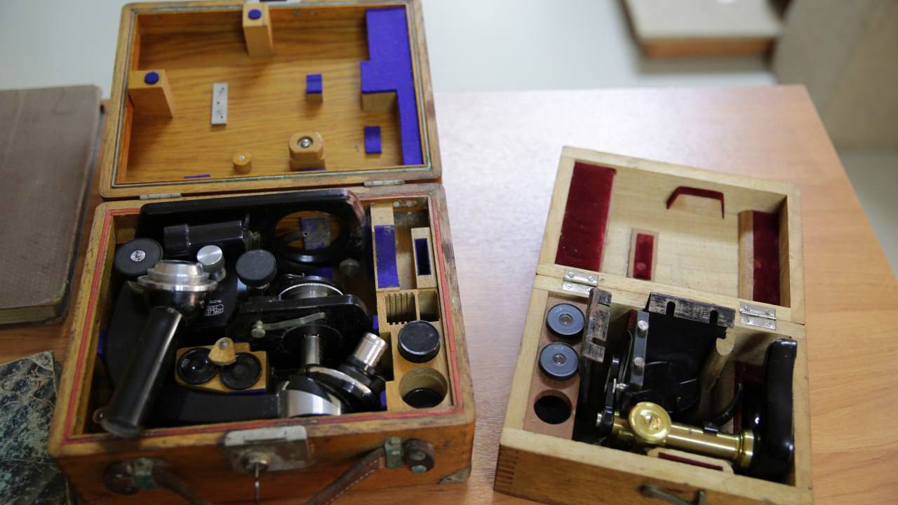 Микроскопы — высокоточные полевые приборы немецкой фирмы Carl Zeiss, выпущенные ещё до 1917 года и до сих пор в отличном рабочем состоянии. Именно ими пользовались Буш в Ермане. Книги — личные издания энциклопедий супругов — тоже насчитывают более века.